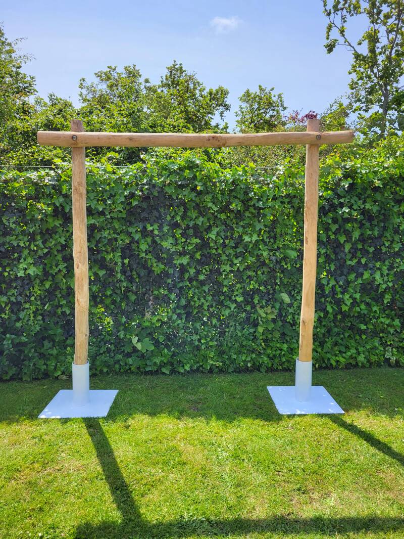 De 'voeten' van de backdrop zijn gemaakt van metaal, zodat hij op iedere ondergrond stevig staat. De grote boomstamschijven kun je leuk gebruiken om de lunch op te zetten en de kleine boomstamschijven op de tafels met bloemen en kaarsen.